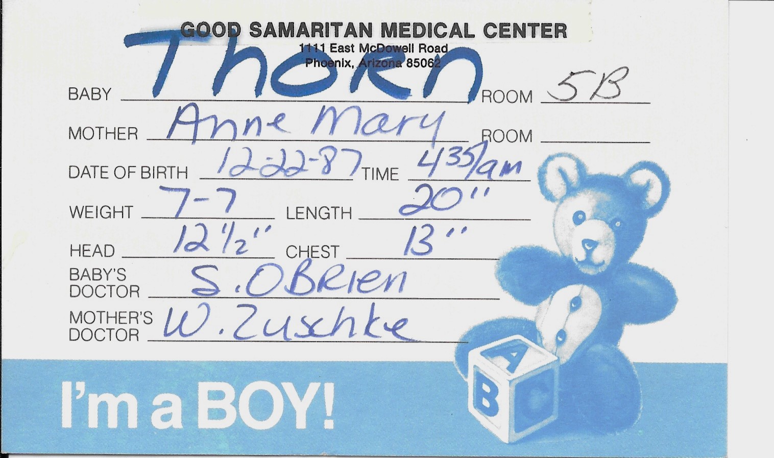 Something told me to ignore their advice and your Dad drove us to The Good Samaritan Hospital in Phoenix, it must have been about 10.30 at night and you arrived at 4.35 am the next morning. You were a perfect baby – 7lb 7oz and very healthy and happy.