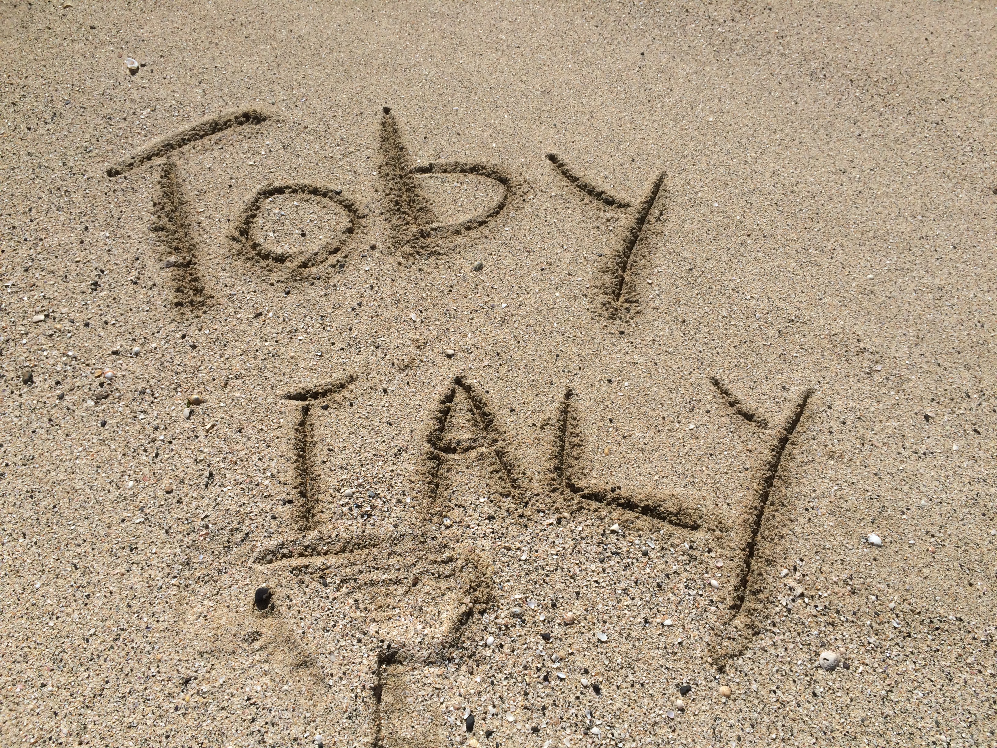 sitting spot, I wrote Toby’s name in the sand. As I sat looking out to sea a single white feather floated down in front of me and I picked it up and put it close to my heart.